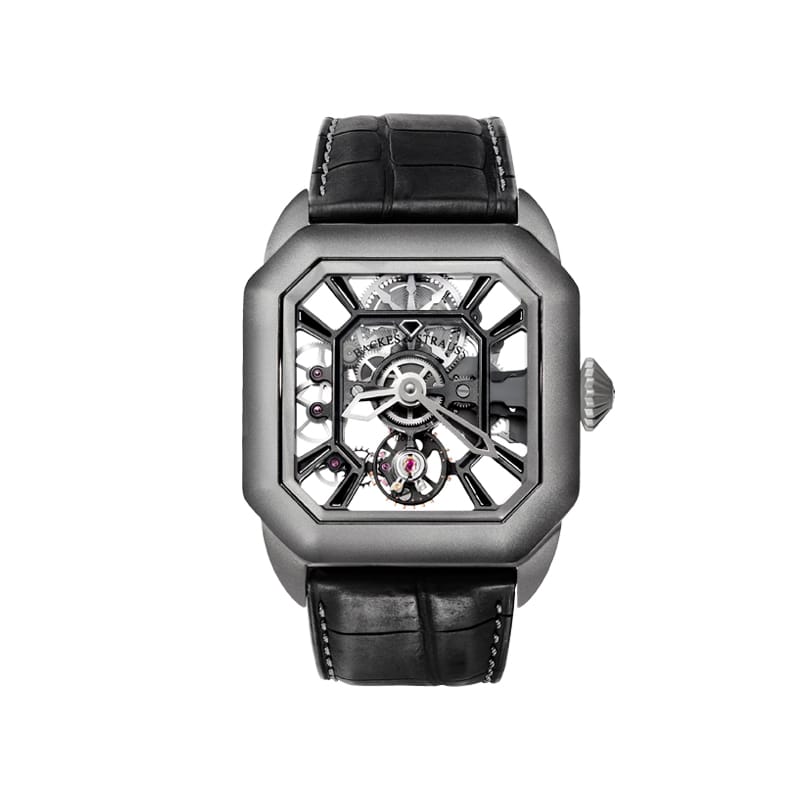 One Backes & Strauss Helios Collection men’s mechanical watch in titanium with an alligator leather strap featuring a sapphire crystal open case back. Serial number: 04/51. Price is in USD.