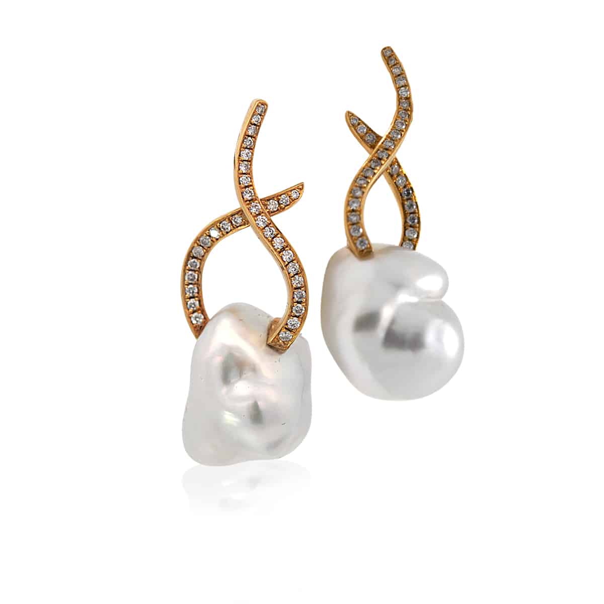 Drop earrings in 18k white gold featuring two (2) free form shaped South Sea cultured pearls (measuring approximately 16mm); and forty-two (42) round brilliant cut diamonds (1.17TCW; VS-SI clarity; G-H colour). The earrings are finished with post and bunny backings.
