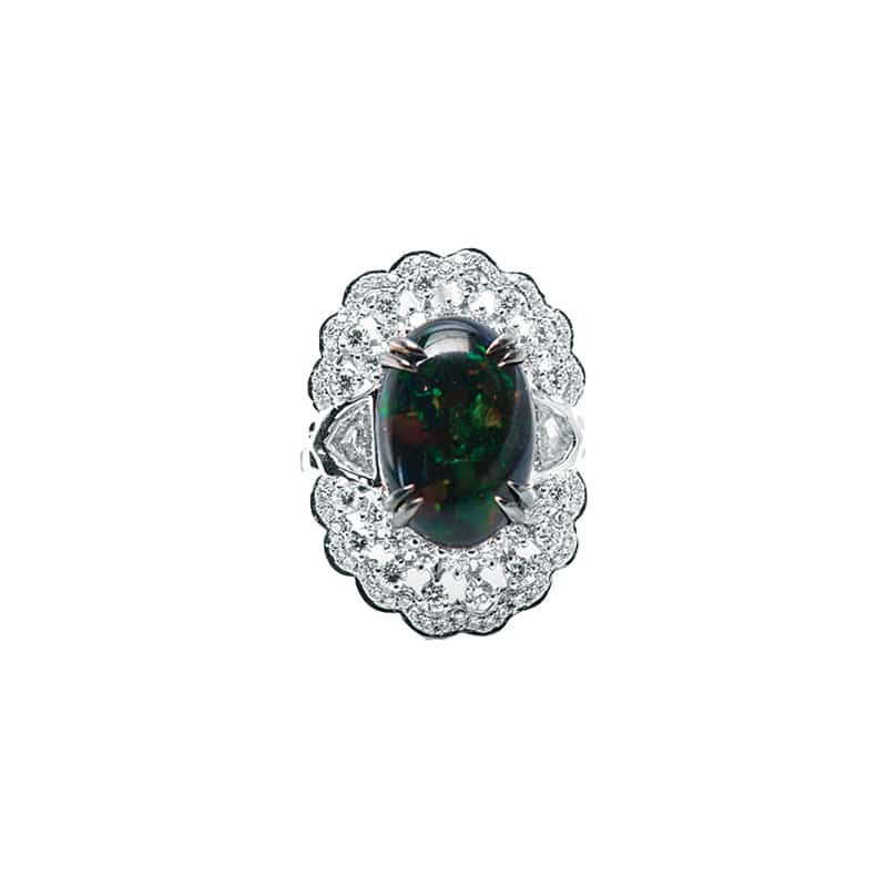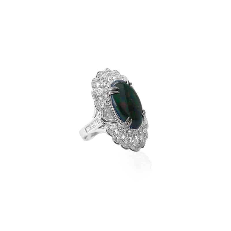 An 18k white gold and white rhodium ring featuring a 6.96 carat black opal, surrounded by 104 round brilliant cut diamonds (1.48cts); and two epaulettes (0/73 carats, E, VS, along with 36 baguette diamonds (0.65 cts) along the shoulders of the ring.