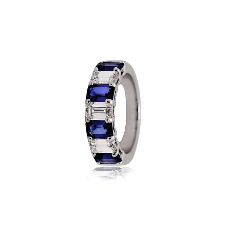 Ring in 18k white gold featuring four (4) emerald cut blue sapphires (2.63TCW) and three (3) emerald cut diamonds (all GIA certified;  0.53CT VVS2/G;  0.50CT VVS2/G;  0.50CT VVS2/G.
