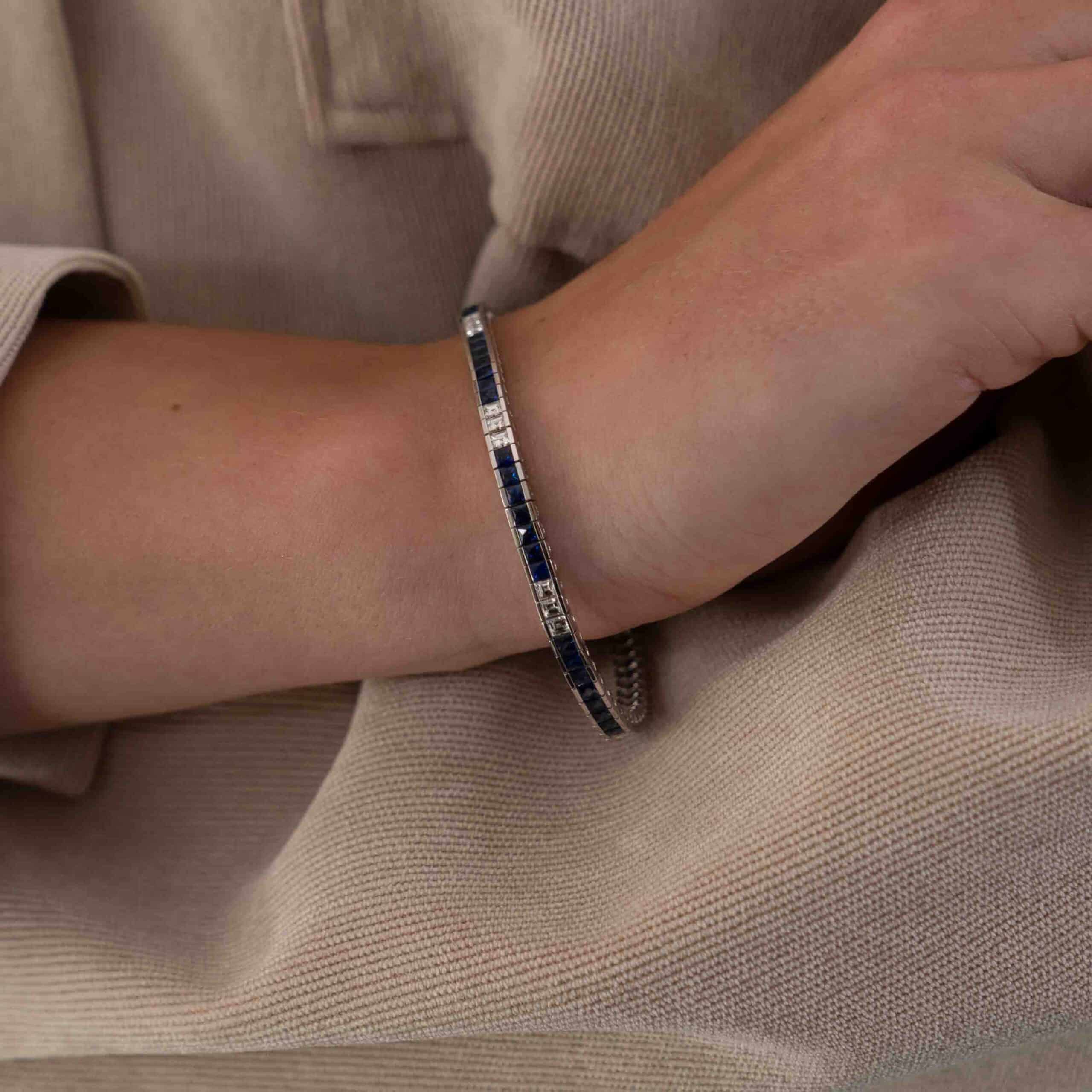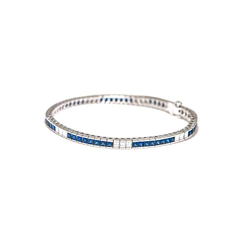 18K White Gold Line Bracelet set with 52 square cut Blue Sapphires weighing 4.90ctw and 21 square cut white Diamonds weighing 1.92ctw