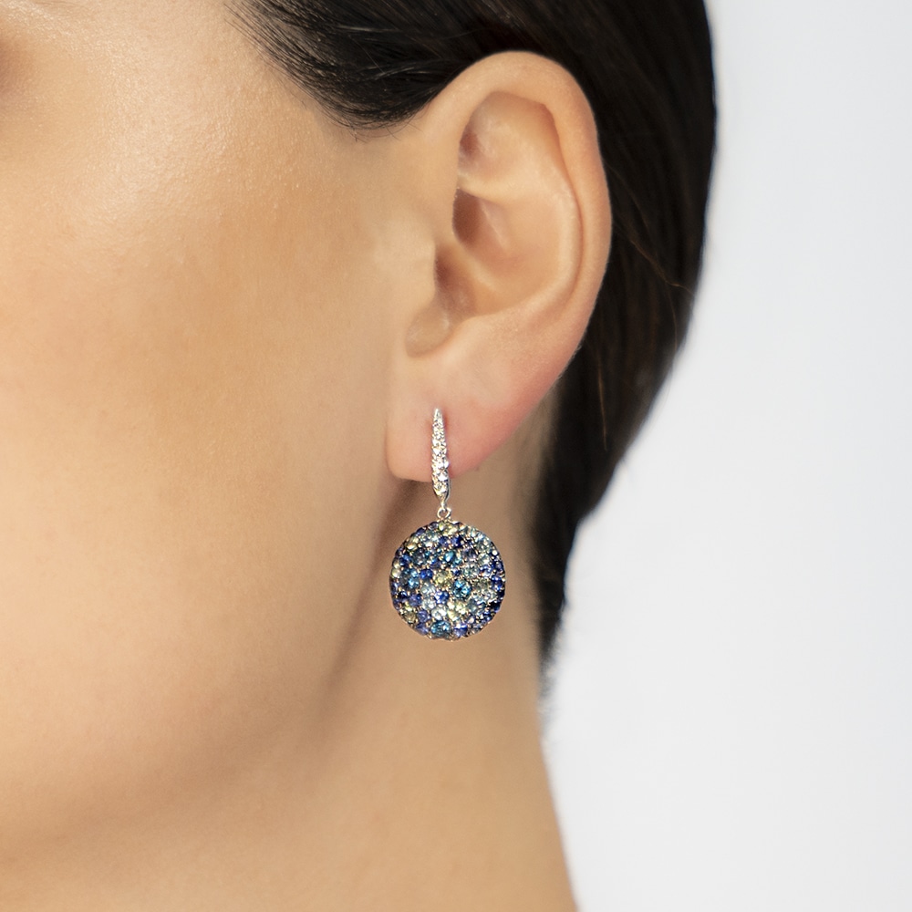 Drop earrings in 18k white gold, featuring round brilliant cut diamonds (0.20cts), accented by blue topaz (2.34cts), green tourmalines (0.79cts) and sapphires (1.87cts).