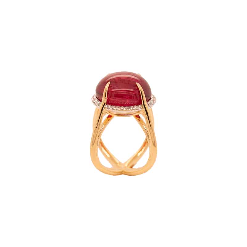 18K yellow gold ring set with one Red Cat’s Eye Tourmaline and accented with diamonds.
