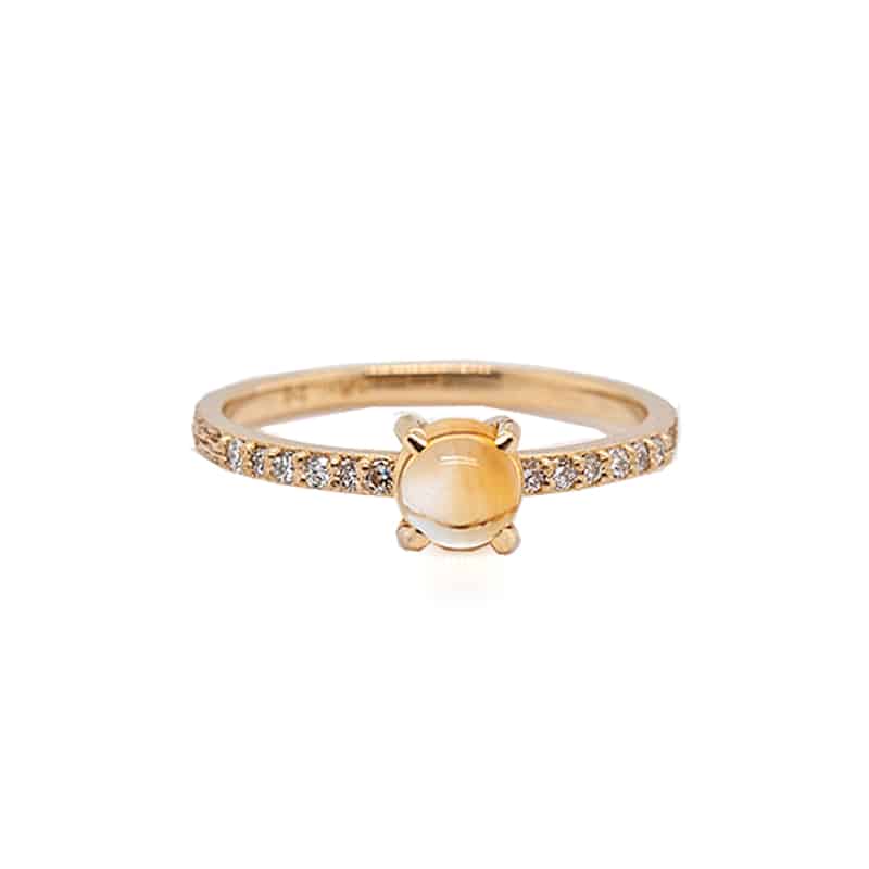One ladies 18kt yellow gold Citrine and Diamond ring from the Stackable ring collection, featuring one round cut Citrine cabochon weighing 0.56cts and 12 round brilliant cut diamonds