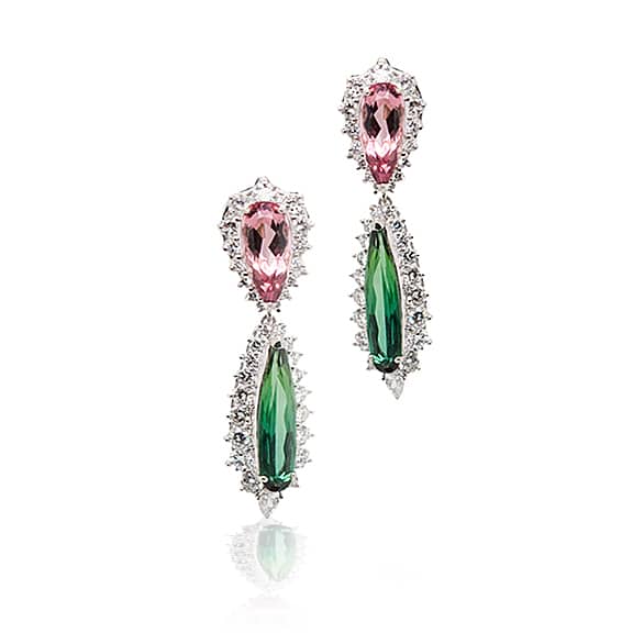 One pair of 18KWG Custom Designed Earrings containing: one pair of pear mixed cut natural pink tourmalines weighing 2.44ctw and one pair of pear mixed cut natural green tourmaline weighing 2.66ctw; The tourmalines are surrounded by 66 round brilliant cut diamonds weighing 1.74ctw G-H VS/SI and 2 pear shape diamonds