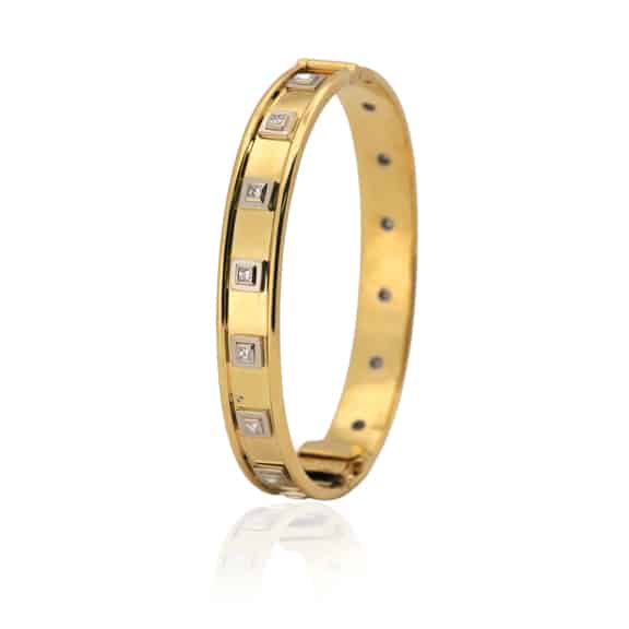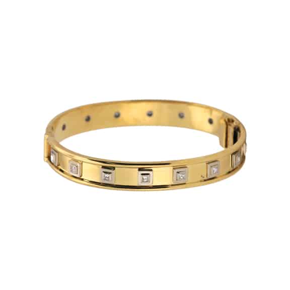 Diamond bangle from our Hardwear Collection in 18k yellow and white gold featuring sixteen (16) princess cut diamonds (0.74TCW; VS clarity; G colour) in bezel settings.