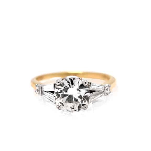 Diamond engagement ring in 18k yellow gold and platinum featuring one (1) round brilliant cut diamond (1.53CT; VS2 clarity; H colour), accented by four (4) tapered baguette cut diamonds (0.40TCW; VVS clarity; G-H colour) and two (2) round brilliant cut diamonds (0.07TCW; SI1-I1 clarity; H-I colour).