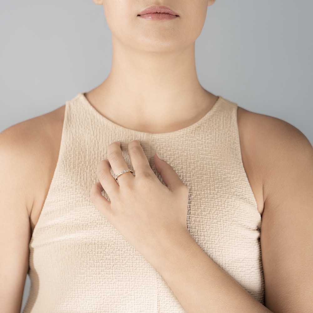 Diamond Eternity band in 18k yellow gold; featuring 12 round brilliant cut diamonds (0.48 cts., G, VS) and 6 straight baguette-cut diamonds (0.71 cts., G, VS) in semi-bezel and shared claw settings.