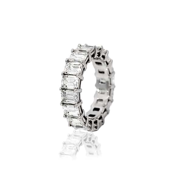Diamond eternity band in 18k white gold featuring eighteen (18) emerald cut diamonds (7.32TCW; VVS1-VS1 clarity; E-F colour).