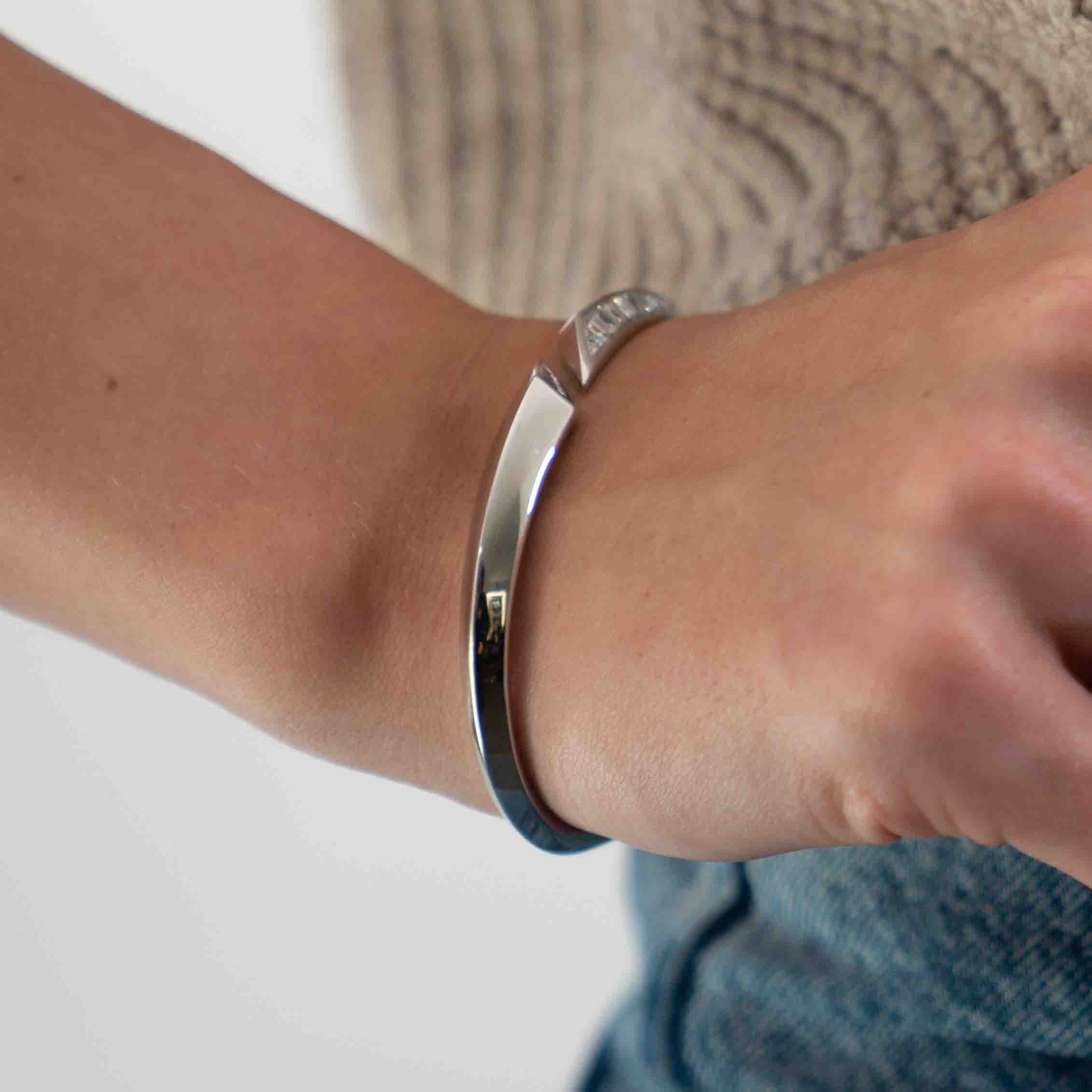 One 18K White Gold Custom made hinged bangle containing 18 fancy cut baguette diamonds weighing 1.80ctw
