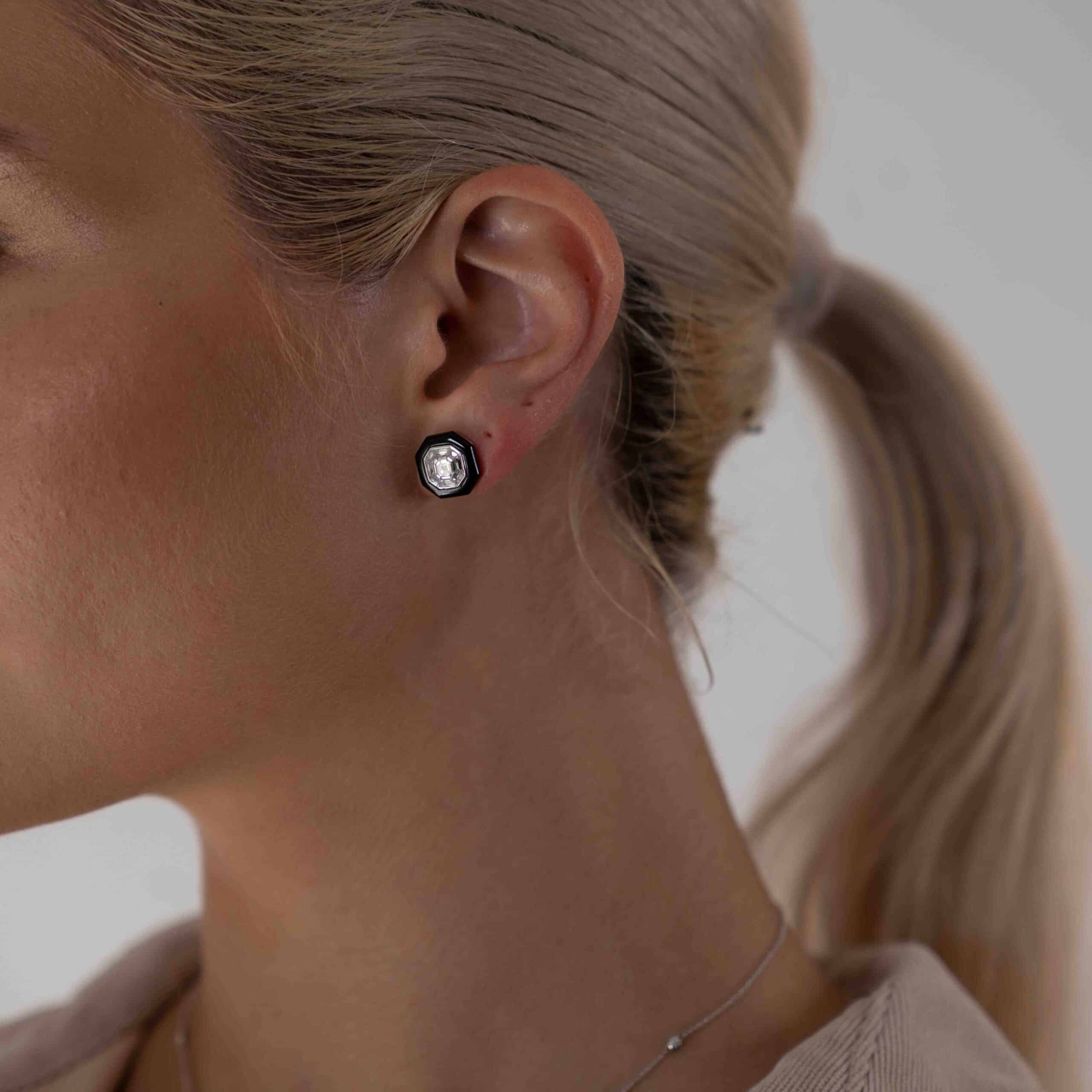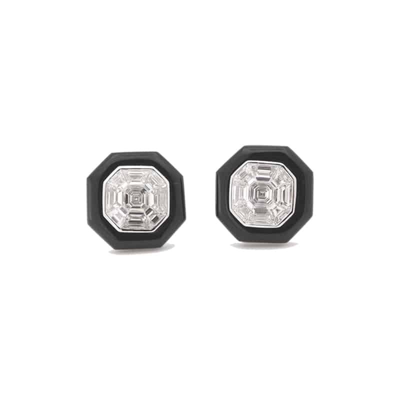 Earrings in 18k white gold featuring two (2) asscher cut diamonds and sixteen (16) calibre cut diamonds (1.17TCW; VS-SI clarity; G-H colour), accented by two (2) custom cut onyx frames (3.54TCW).
