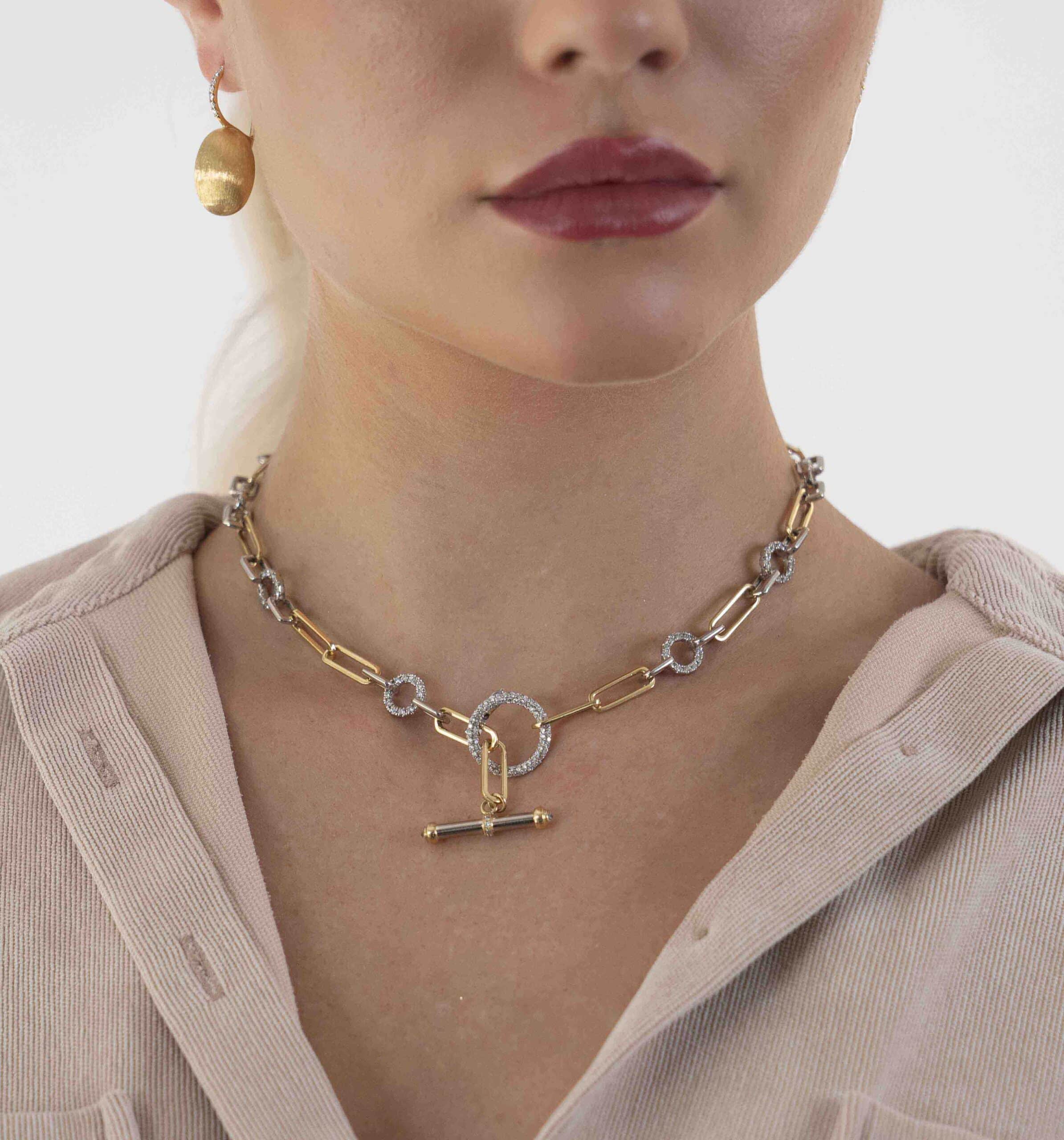 Necklace in 18k yellow and white gold featuring fifteen (15) yellow gold paper clip links and eleven (11) white gold double sided diamond pave links, accented by a diamond set toggle bar clasp closure (4.79TCW of round brilliant cut diamonds; VS-SI clarity; G-H colour). The necklace is 18″ total in length and is adjustable.