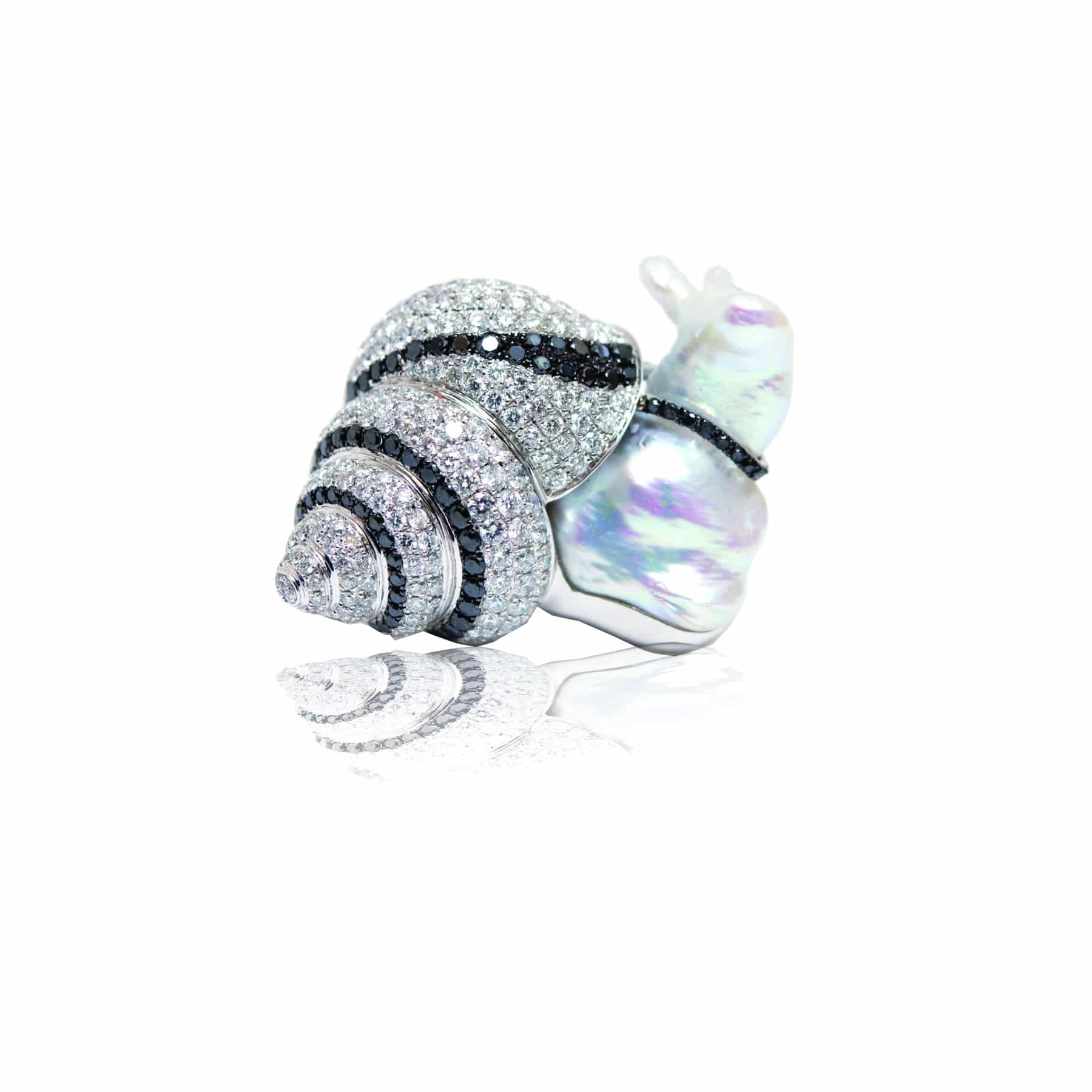 Snail Brooch set in 18k White Gold; featuring Baroque pearls; accented by black diamonds (0.68cts.) and white diamonds (2.79cts.; VS G-H) in pavé settings.