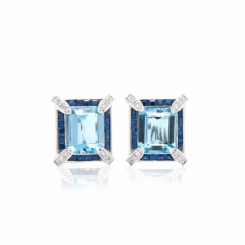 Earrings in 18k white gold featuring two (2) emerald cut aquamarines (11.10TCW), accented by thirty-six (36) calibre cut blue sapphires (1.50TCW) and twenty-four (24) round brilliant cut diamonds (0.20TCW; VVS clarity; H-I colour).