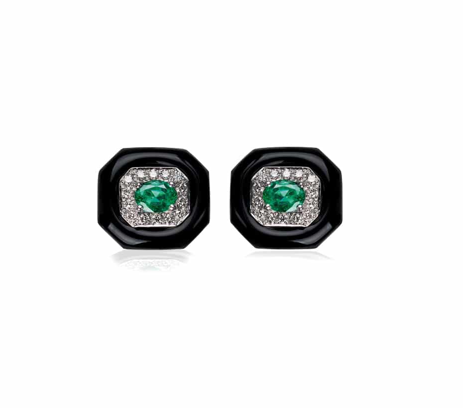 One pair of 18K White Gold Nikos Koulis Oui Collection studs set with 0.37ctw Emerald centers, 0.24ctw white diamond pavé, and black enamel