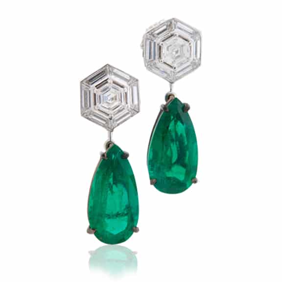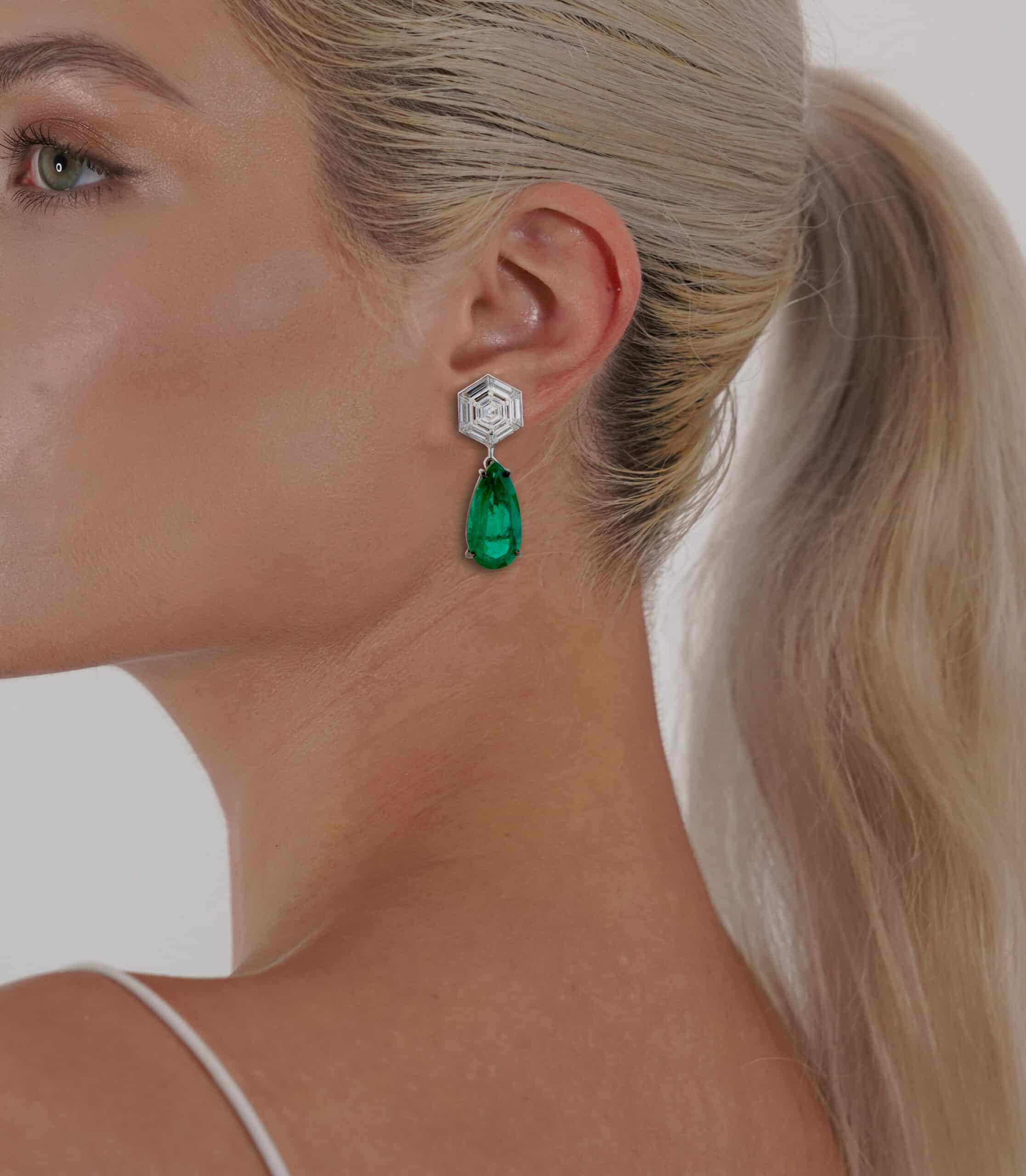 Drop earrings in platinum and 18k white gold (black rhodium finished drops) featuring two (2) pear shaped emeralds (14.22CT); accented by two (2) hexagonal cut diamonds (1.46TCW; VS1 clarity; F colour), and twelve (12) custom cut and fitted trapezoid cut diamonds (2.40TCW; VVS clarity; F-G colour).