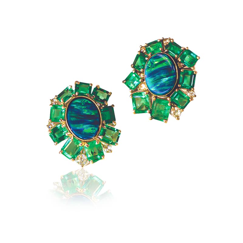 One pair of 18K Yellow Gold Cluster Earrings set with oval shaped Opals weighing 4.30ctw, rectangular facetted Emeralds weighing 6.68ctw and rose cut Diamonds weighing 0.32ctw