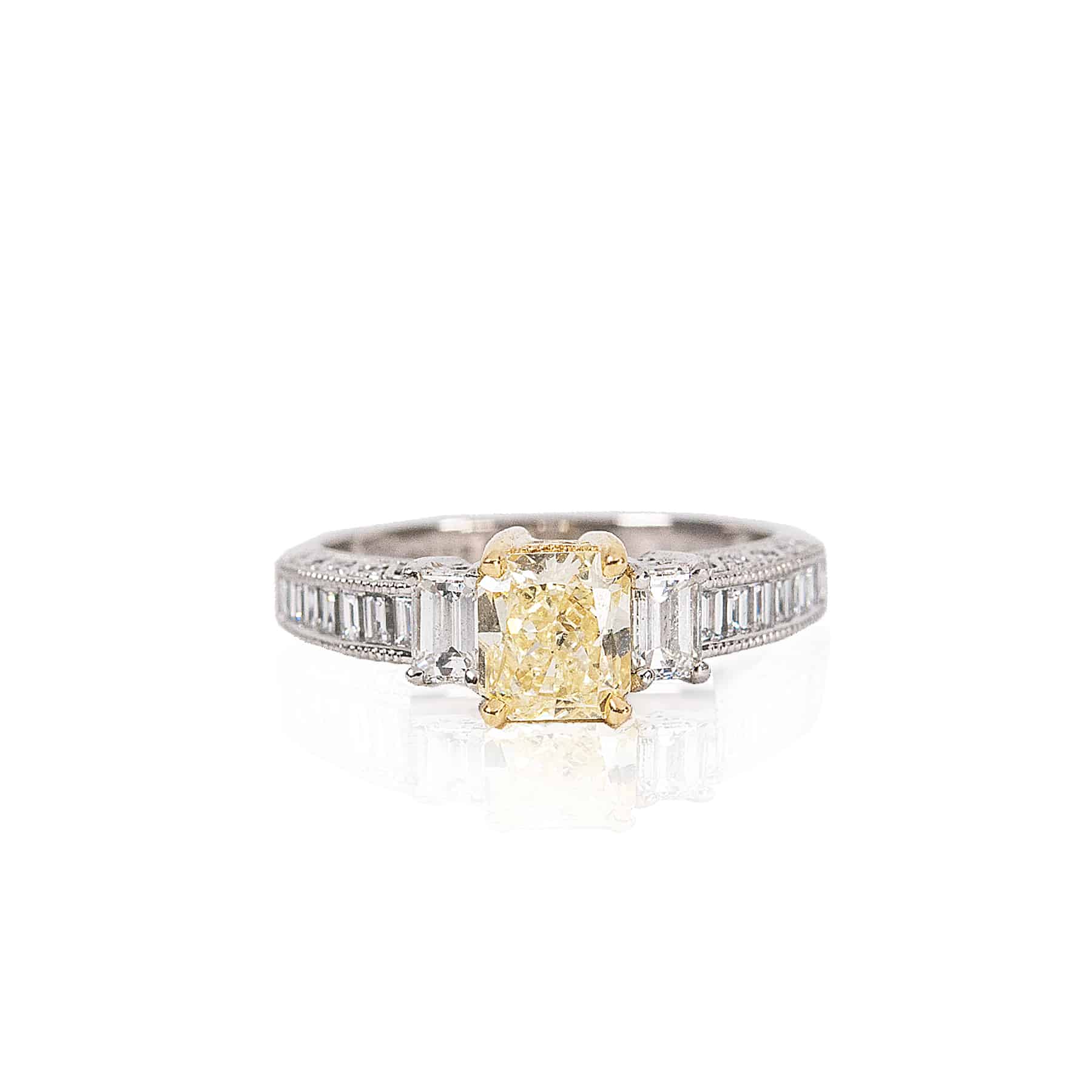 One platinum and 18k yellow gold diamond ring from our Bridal Collection, featuring a radiant cut fancy light yellow diamond, 1.12ct, VS1, accented by two emerald-cut diamonds, 0.40ctw, G, VS1, 14 baguette cut diamonds, 0.30ctw, G, VS-VVS, 28 round brilliant cut diamonds, 0.15ctw, GH VS, in claw, channel and bead settings.