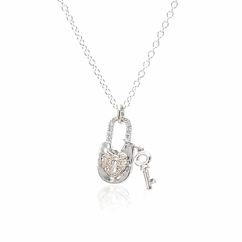 18K white and rose gold necklace featuring a heart locket pendant accented with diamonds.