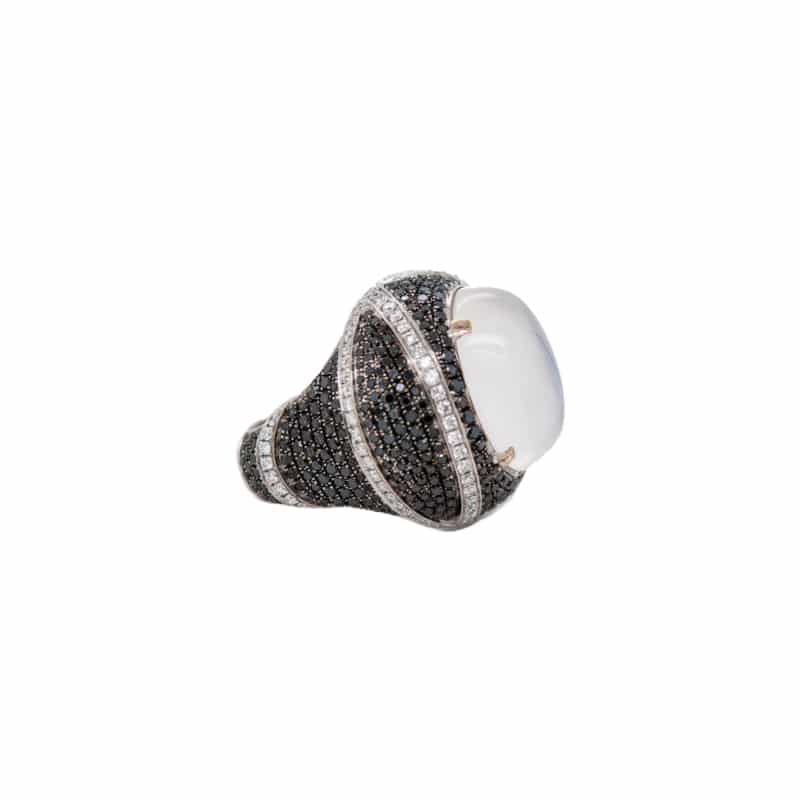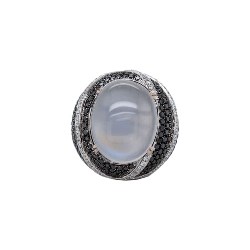 A cocktail ring in 18k white gold with black rhodium, featuring an oval cabochon moonstone (16.31cts.) in a four double-claw setting; accented by 415 round brilliant cut black diamonds (3.32cts); and 108 round brilliant cut diamonds (1.08cts., SI2, E-G) in a pavé setting.