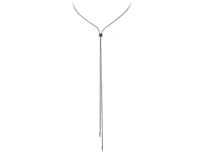 18K White Gold Nikos Koulis Oui Collection Necklace. Black enamel Lariat set with 0.15ct Emerald, accented by 0.12ctw pave diamonds.
