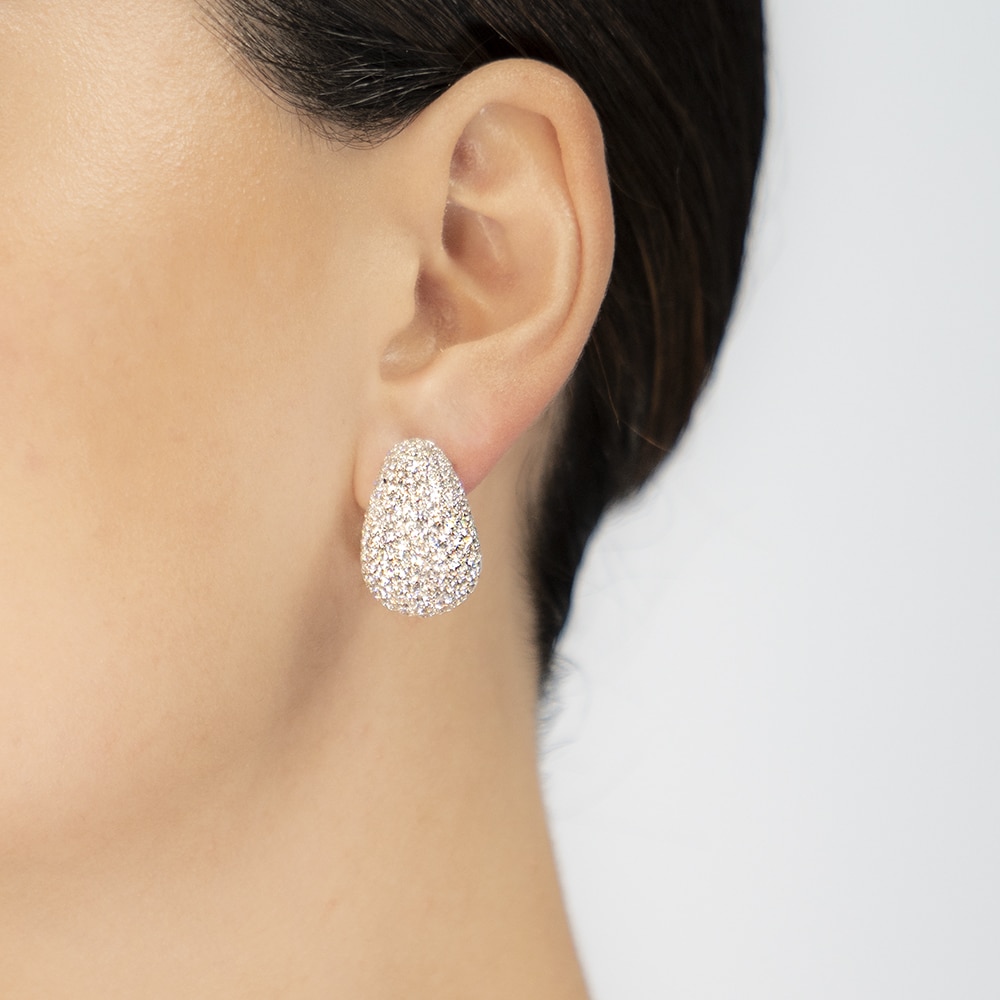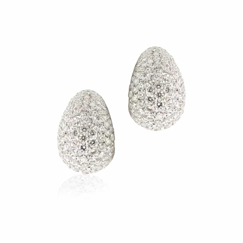 18k white gold pear-shaped huggies featuring diamond pavé (9.98 cts. VVS-VS-FG) and lever backings.