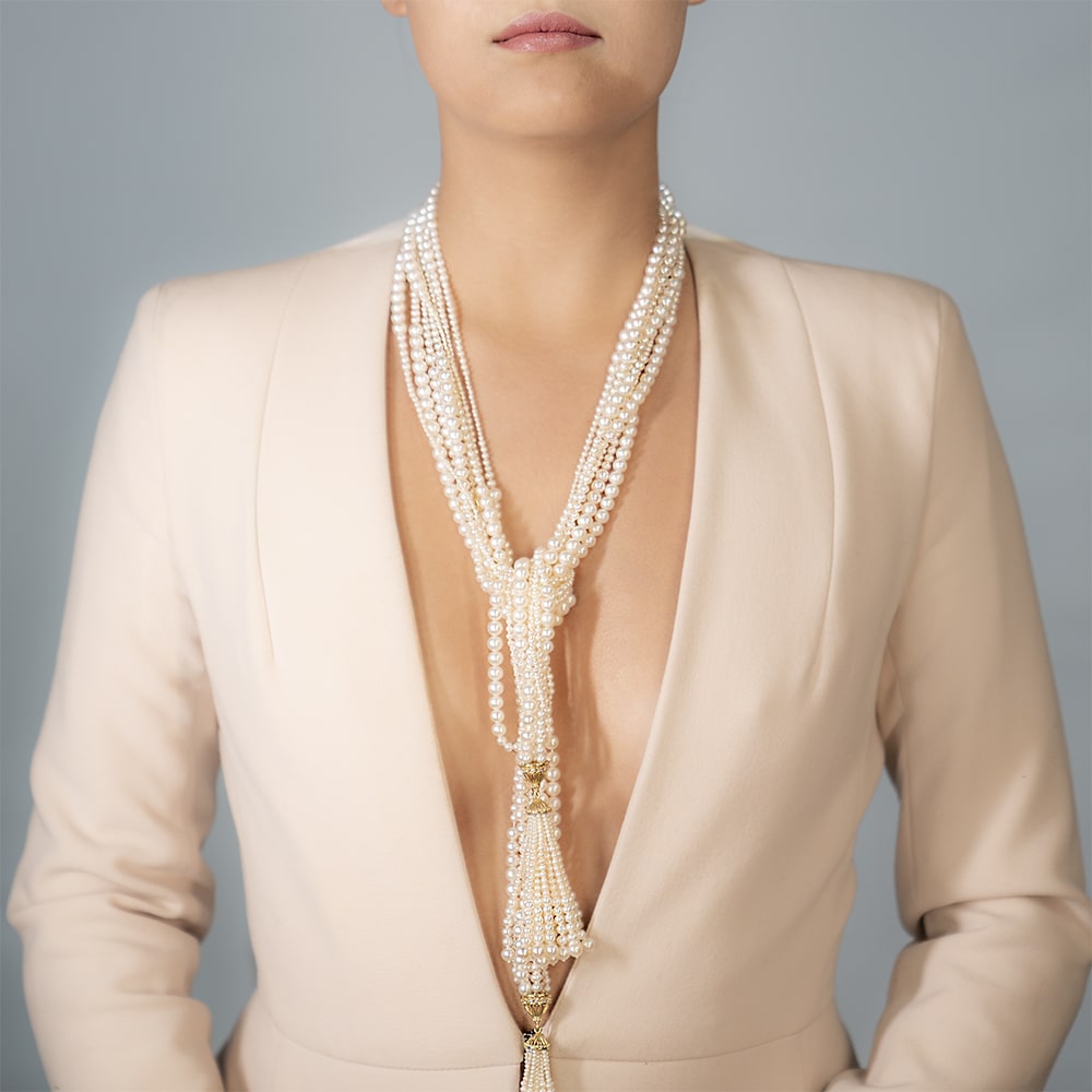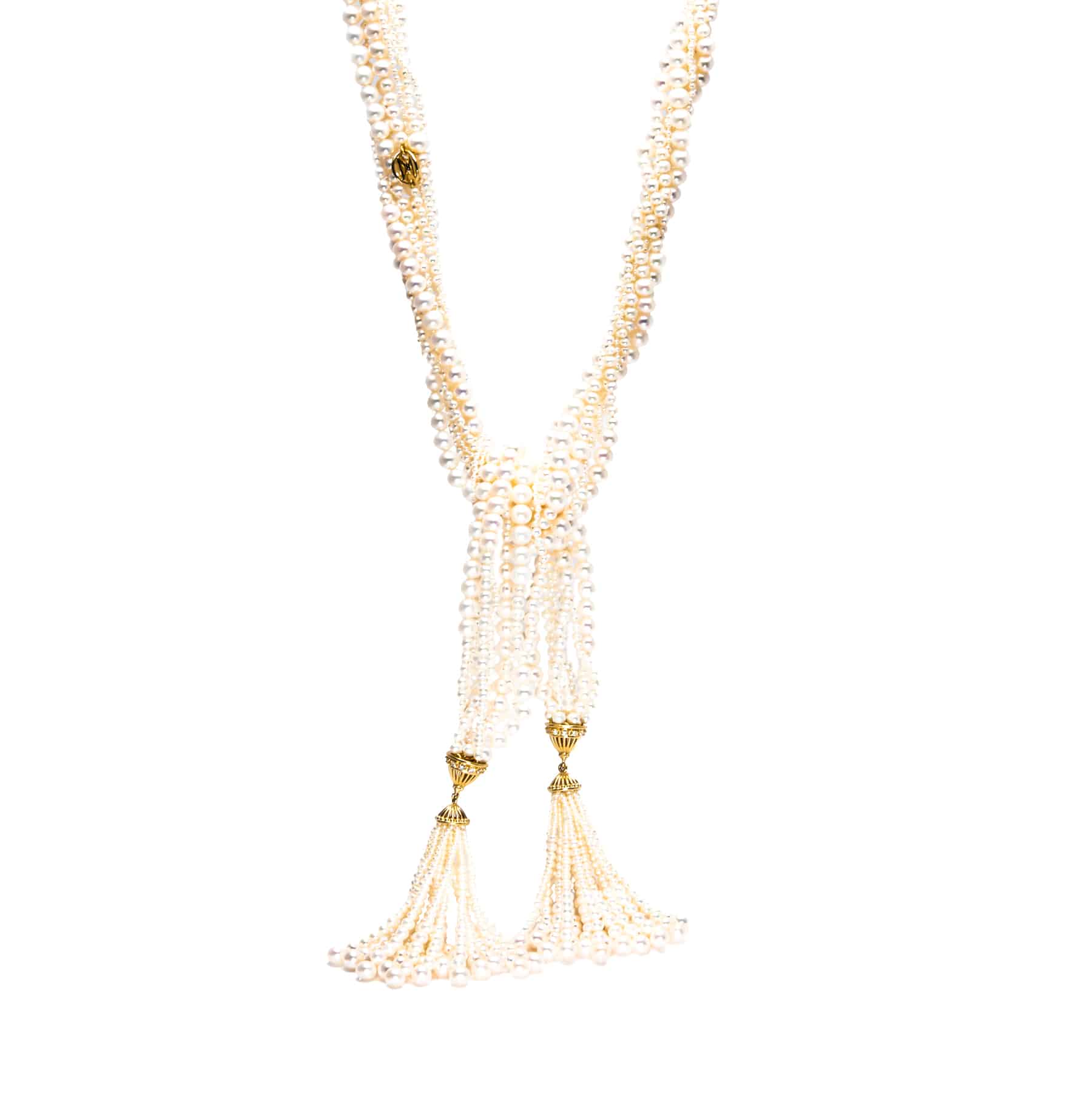 Pearl lariat necklace with tassels in 18k yellow gold. Featuring 8 strands of freshwater pearls (2.0-7.0mm, round, white), accented by 24 round brilliant cut diamonds (0.77tcw, VS, G).
