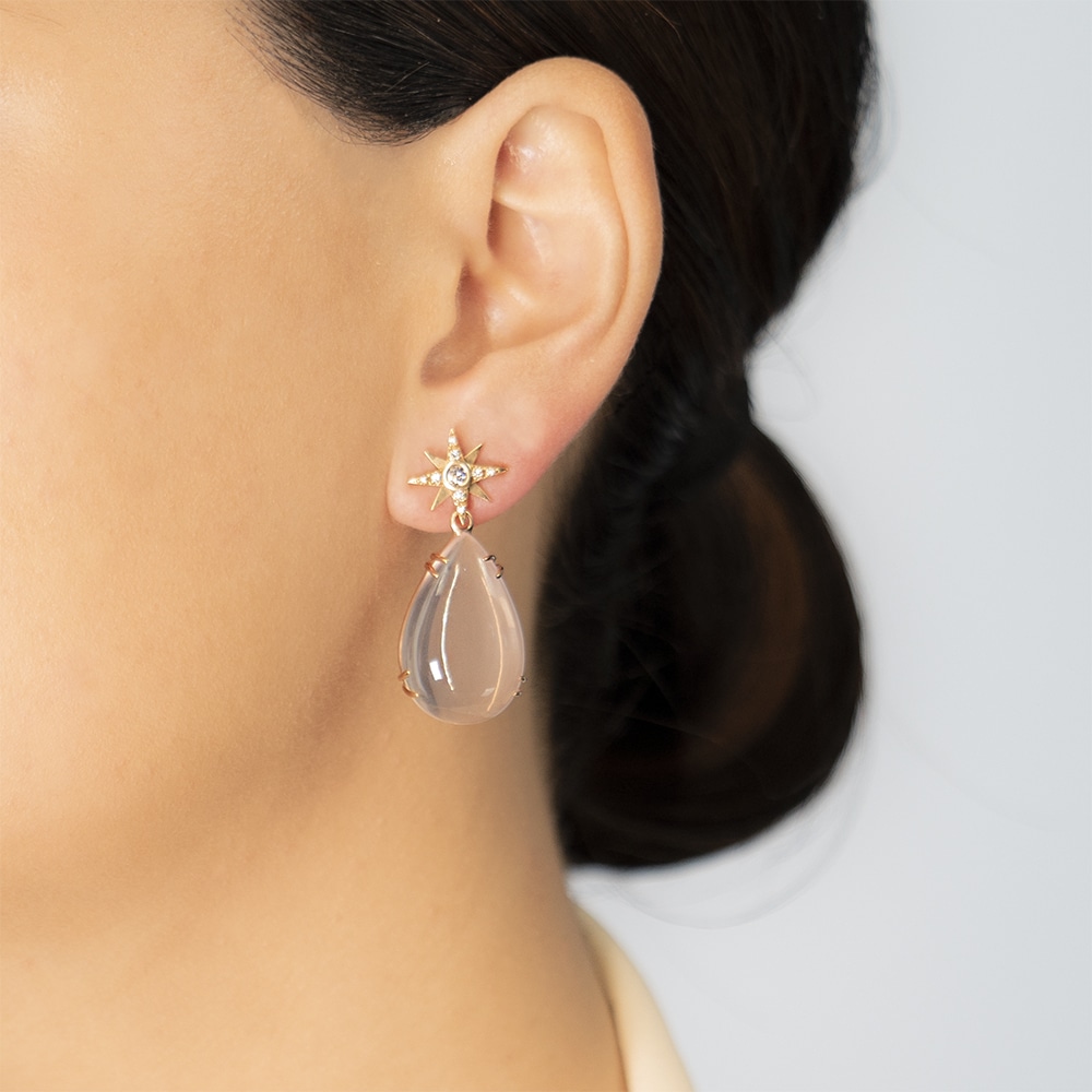 Earrings fron our Magical Woodlands Collection in 18k rose gold, set with 2 pear-shaped rose quartz cabachon stones (10 cts); and accented by 18 round brilliant cut diamonds (0.27cts)