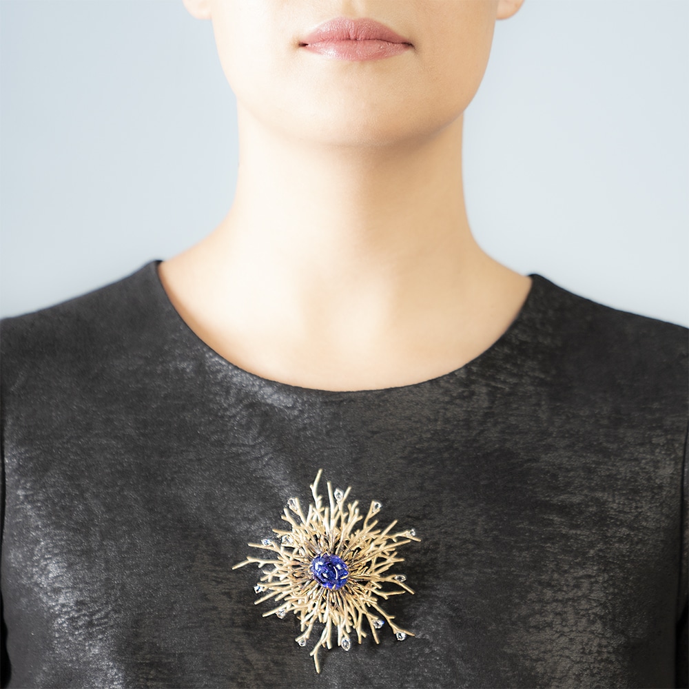 A brooch from our Nest Collection in 18k yellow and white gold featuring oval cabochon Tanzanite (22.94cts); accented by 13 assorted rose cut diamonds (1.16cts) in claw settings.