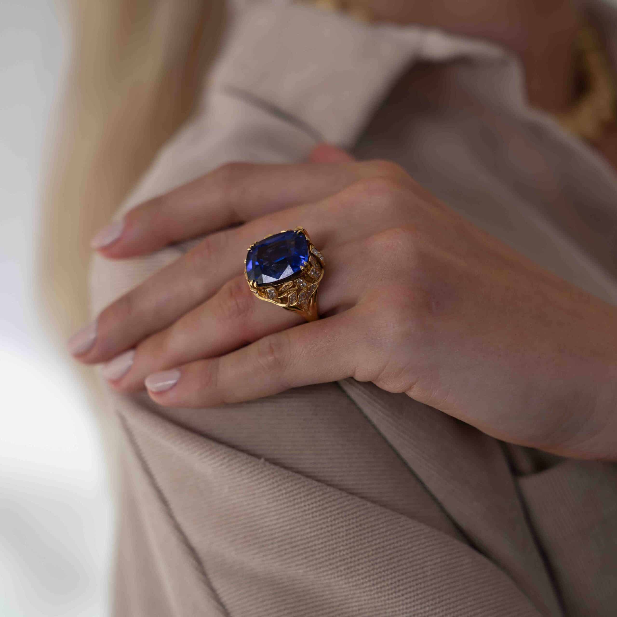 A tanzanite cocktail ring in 18k yellow gold, featuring a cushion cut tanzanite (20.08cts) in prong setting; accented by 82 round brilliant cut diamonds (1.76cts, VVS-VS, G) in bead setting.