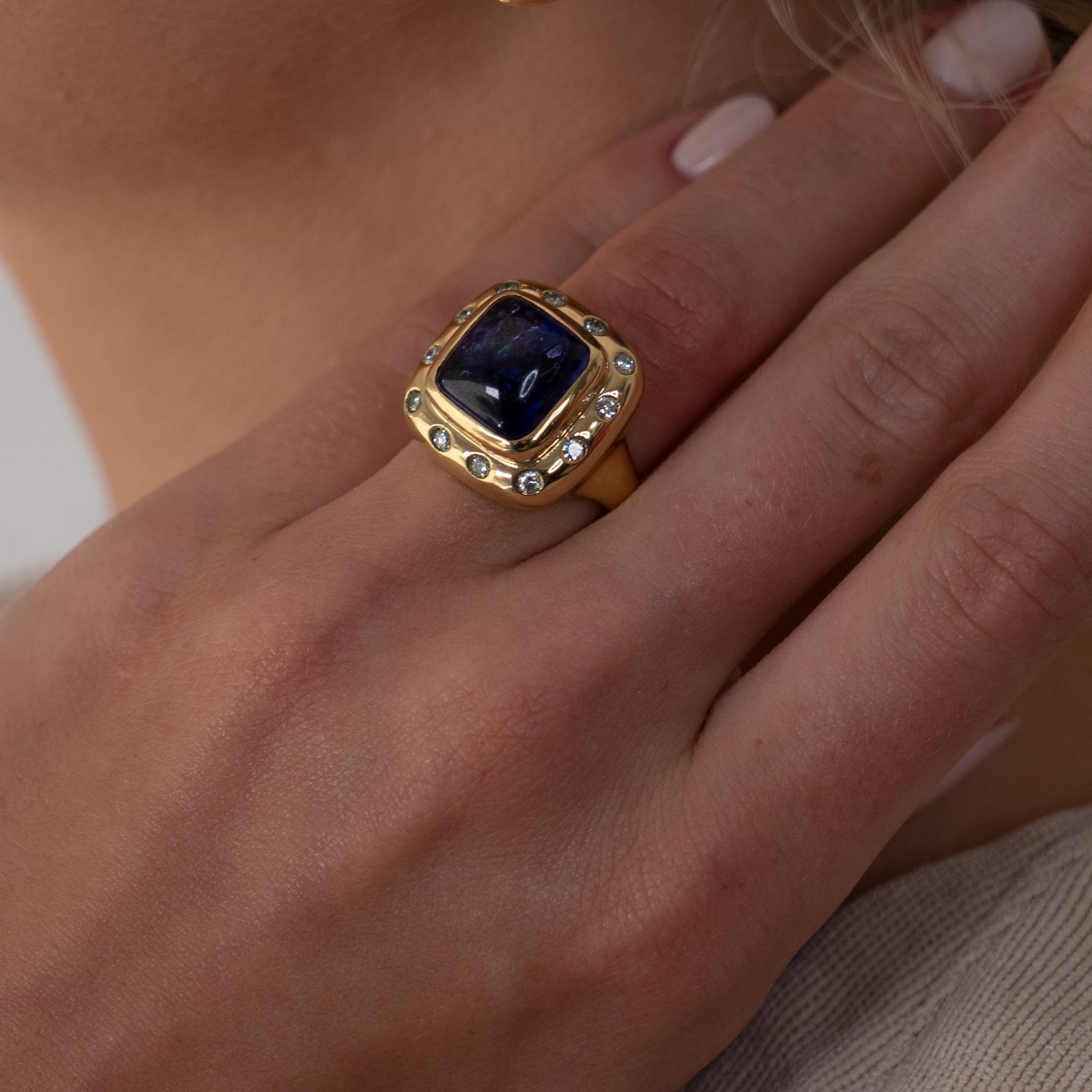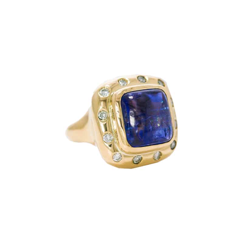 18K yellow gold statement ring featuring a square cabochon cut 13.43ct tanzanite framed by 12 gypsy set diamonds (0.40ctw)