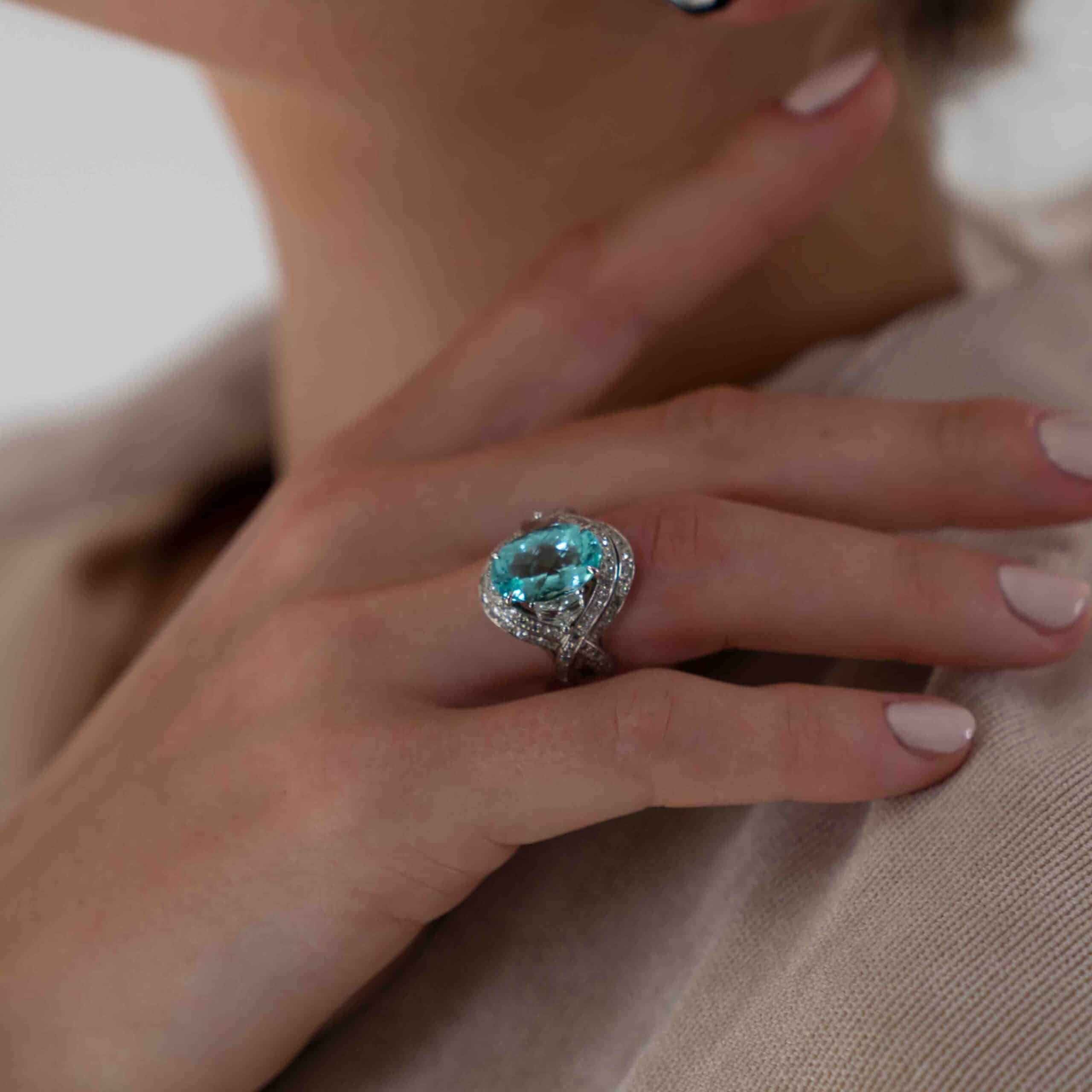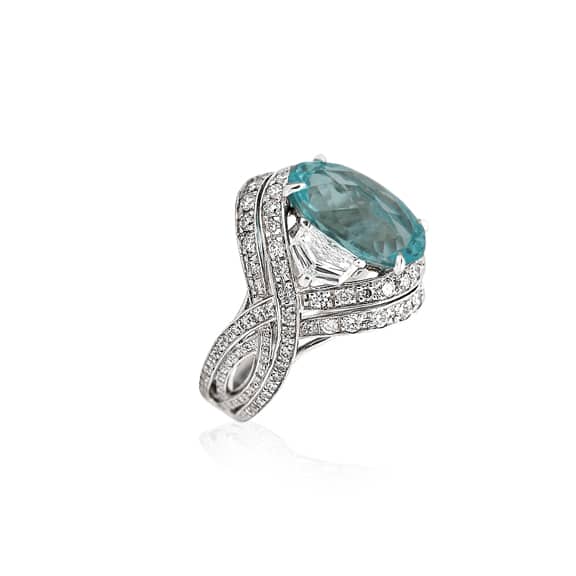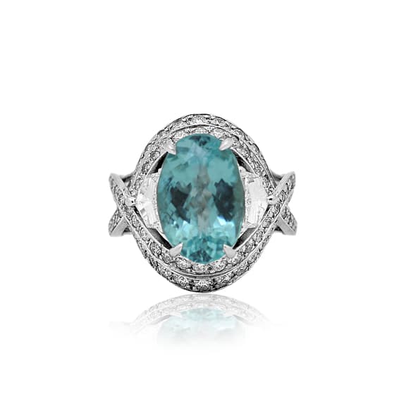 A platinum ring, featuring a facetted oval Paraiba tourmaline (5.19cts., greenish blue) in a four-claw setting, accented by 2 epaulette-shaped diamonds (0.86cts., VS, G) in prong settings, and 132 round brilliant cut diamonds (0.64cts., VS-SI, G-H) in a pavé setting.