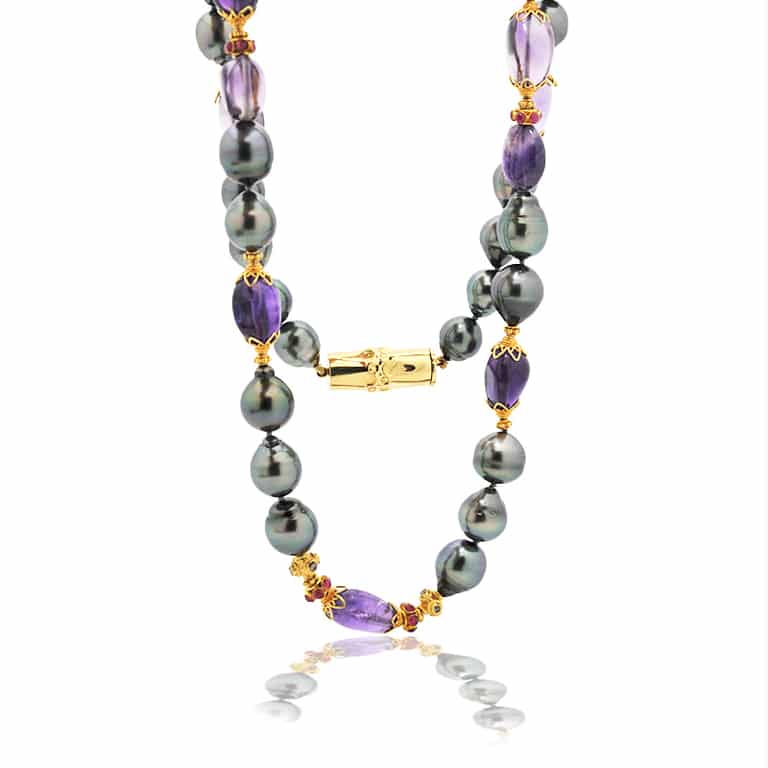 Verdura byzantine 18kt.yellow gold necklace featuring 32 Tahitian pearls; 17 amethysts; twelve vintage spacers with diamonds and rubies; 32.5 inches in length.