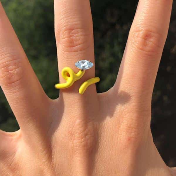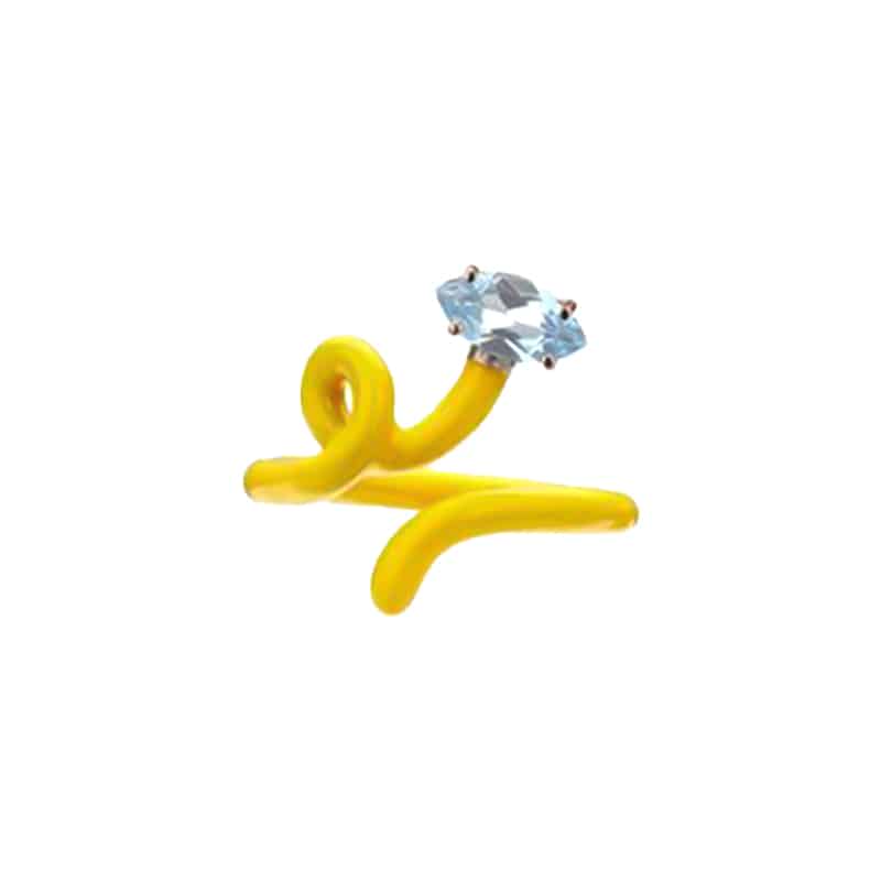 One 9K Yellow Gold Bea Bongiasca Baby Vine Tendril Ring set with one marquise shape 0.55ctw Blue Topaz and Yellow Enamel.