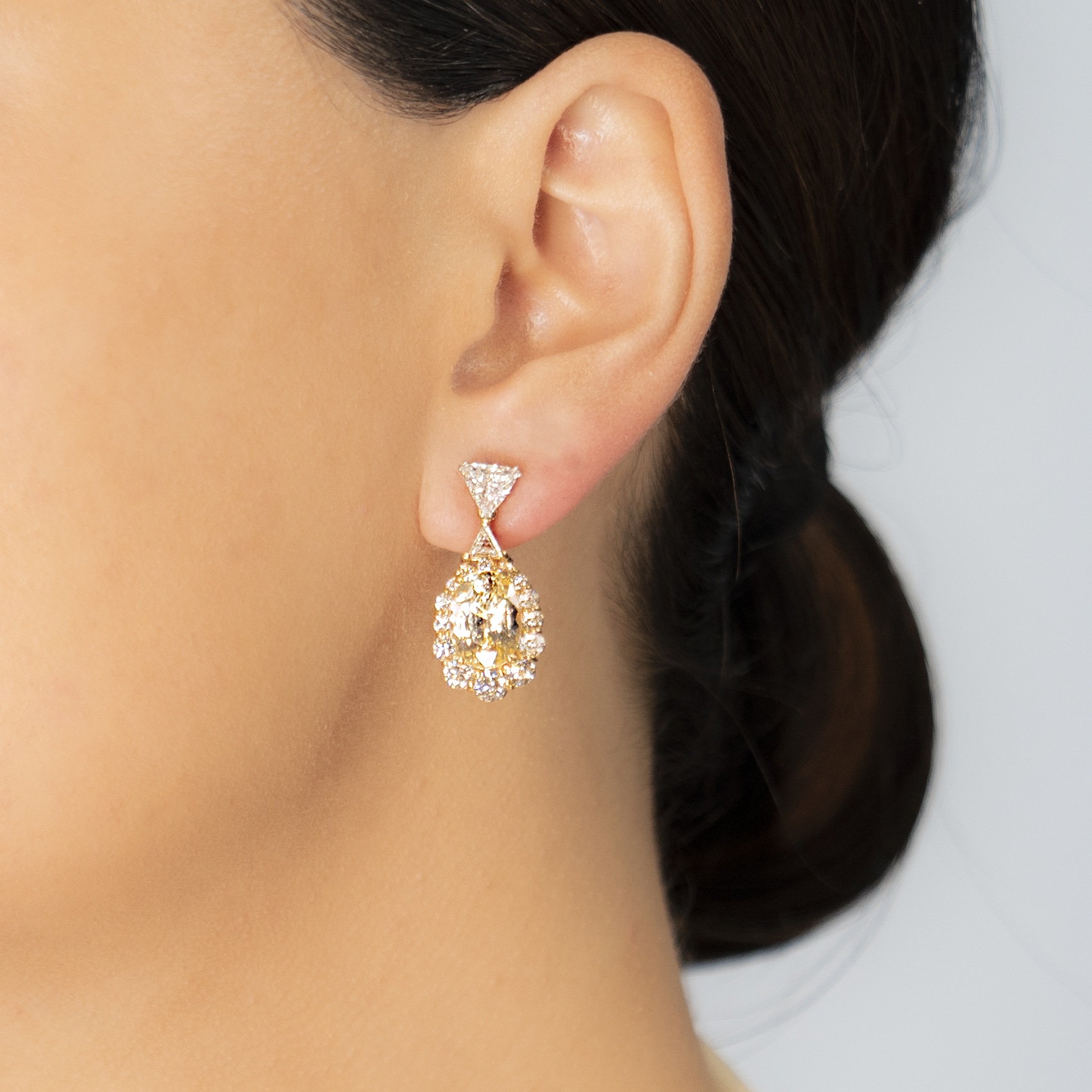 Drop Earrings in Platinum and 18k yellow gold, featuring Oval Yellow Sapphires (10.27 cts); accented by a Halo of graduating Diamonds 1.84cts and Trillion Cut Diamonds (0.57cts) in claw settings.